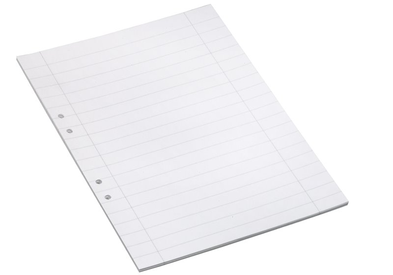 Arbetsblad, A4-skrivpapper med med svensk hålning, linjerat med marginal.