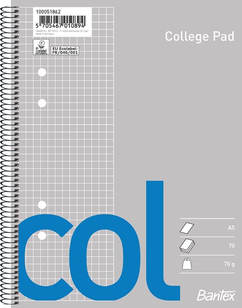 Online katalog » Anteckningsböcker och block » Anteckningsböcker/block » Spiralinbundna » Bantex Col » A5+ » Bantex Col kollegieblock, A5+, rutat, svensk hålning,