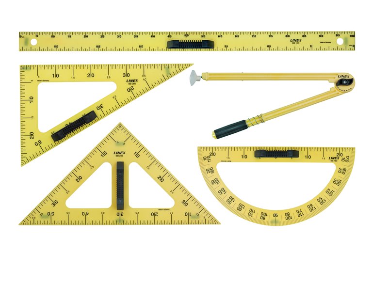 Ett komplett set med linjal 100 cm 100412000, trekanter 30/60° ock 45/45°, vinkelmätare och passar med 45 cm armar för tavelanvändning. Alla produkter är pressgjutna i gul plast och försedda med handtag för bättre grepp vid arbete på tavla. Metrisk indelning.(High impact Polystyrene)