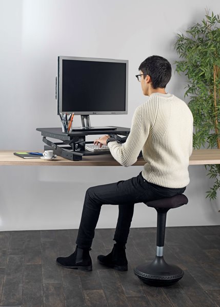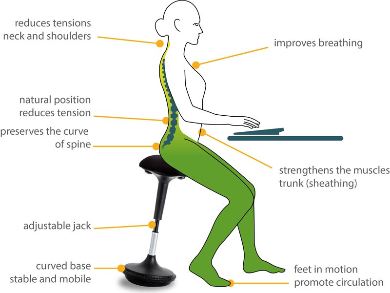 MOOVE Seat har en stor rörelsefrihet och kan justeras i höjd från 52–81 cm med hjälp av gascylindrarna. Den runda foten gör det alltid möjligt att sitta rätt och undvika skador i rygg, axlar, nacke och armar.